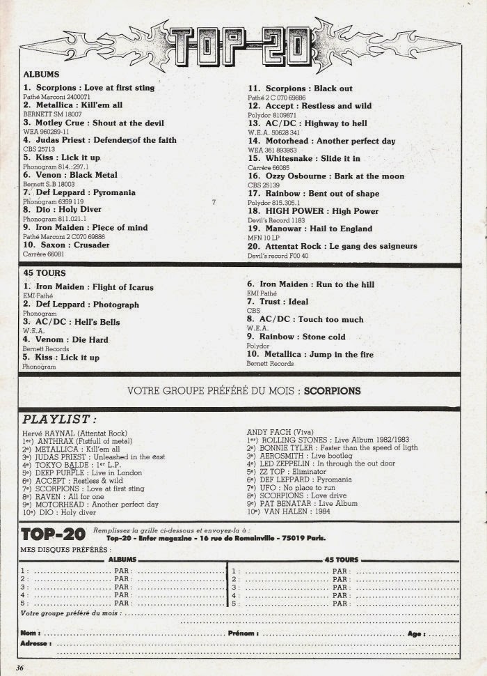 Uma das maiores curiosidades está na última imagem que reproduz um top de votações regulares efetuadas pelos leitores da revista e que nos mostra os gostos da altura com uma lista de 20 álbuns e outra de 10 singles, sendo os Scorpions considerado grupo preferido do mês.